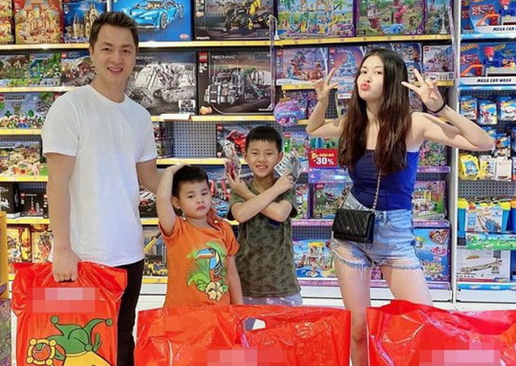 Vợ chồng Đăng Khôi mua hẳn 3 túi quà khổng lồ cho 2 quý tử.