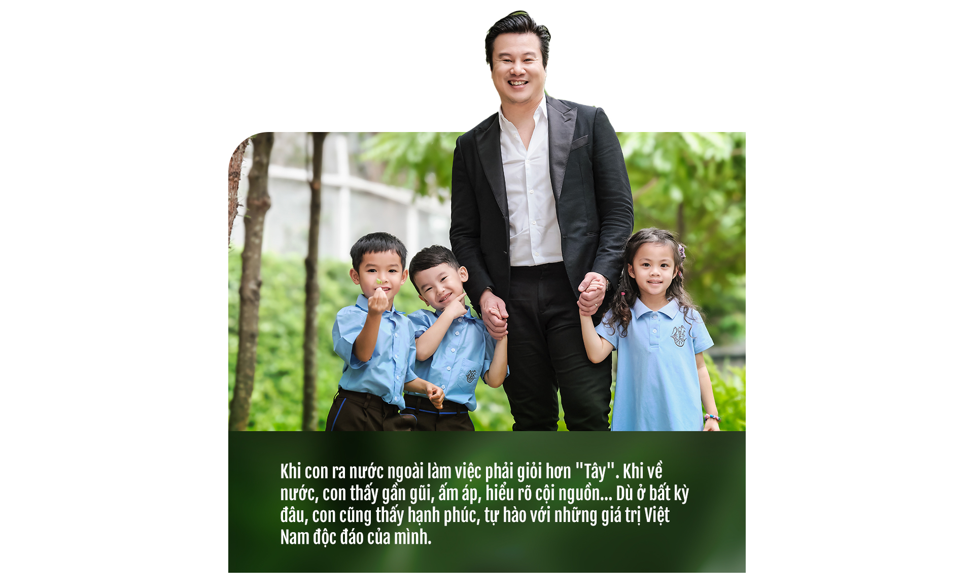 Tuy nhiên, khi tôi có con, trở thành một người cha, tôi muốn dành cho con những gì tốt đẹp nhất. Tôi muốn con mình tự tin, mạnh mẽ, đủ năng lực để cạnh tranh sòng phẳng với bạn bè quốc tế nhưng tôi cũng muốn con giữ được những giá trị Việt Nam, muốn con hiểu và yêu tiếng Việt, yêu văn hóa, cội nguồn nơi mình sinh ra và lớn lên.
