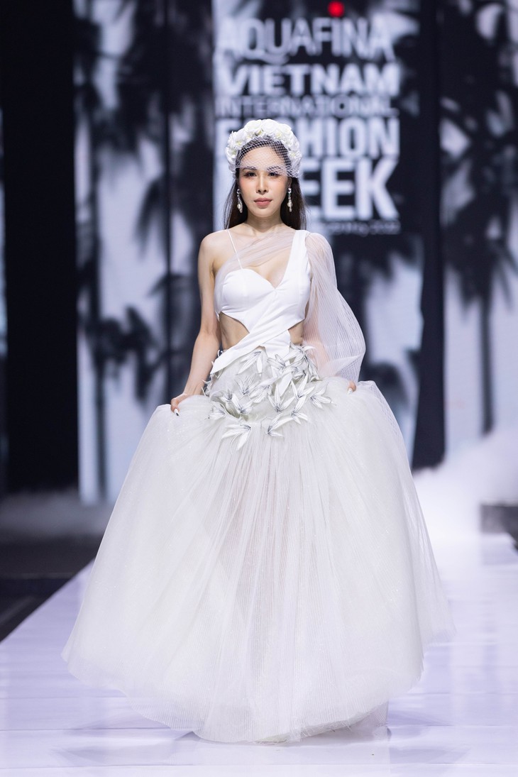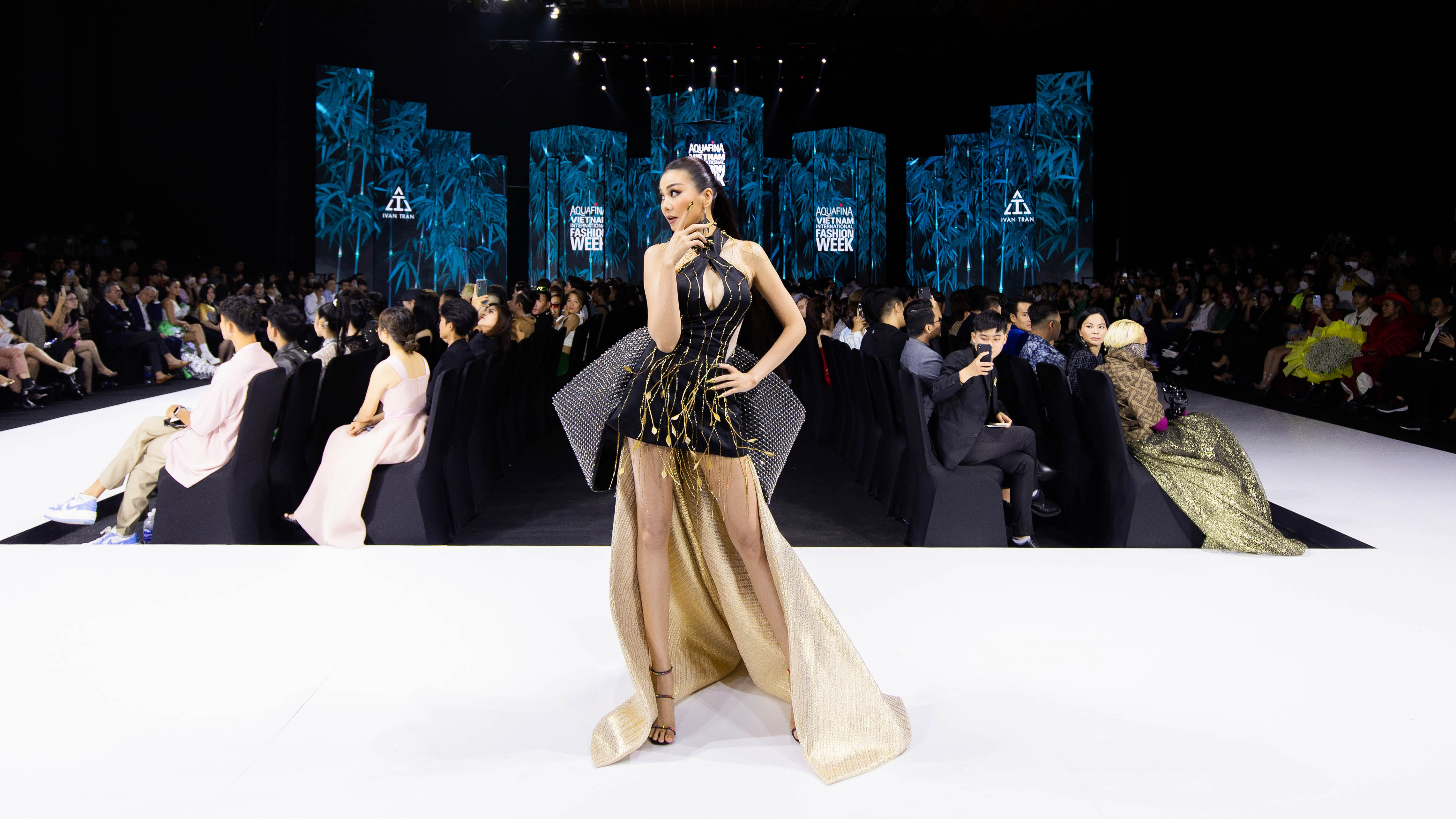 Siêu mẫu Thanh Hằng thần thái trên sàn runway - Ảnh: BTCTrong bộ sưu tập Trúc của nhà thiết kế Ivan Trần, siêu mẫu Thanh Hằng đảm nhận vai trò vedette. Cô để lại ấn tượng mạnh với lối trình diễn đẳng cấp.