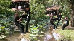 Chàng trai trổ tài đi cầu khỉ ngã cắm đầu xuống ao bùn khiến nhiều người xem phì cười.