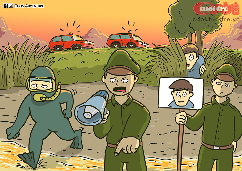 Sau khi nhận được thông tin D.V.U. mất tích, lực lượng cứu hộ cứu nạn công an tỉnh Bình Dương đã cử người xuống hiện trường tìm xác D.V.U. Mất hơn 15 giờ, đội người nhái tỉnh Bình Dương vẫn không tìm thấy tung tích của D.V.U. Cả đội định thu quân trở về thì phát hiện D.V.U. đang núp lùm quan sát đội người nhái, thử tài tìm xác chính mình!