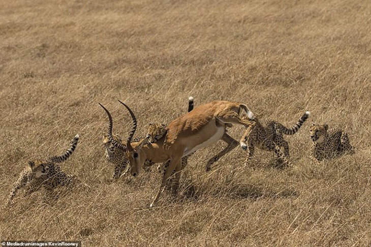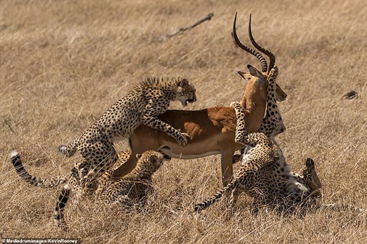 4 con báo con sau đó cũng nhanh chóng vào cuộc. Chúng đều nhảy lên lưng linh dương trong khi con vật tuyệt vọng đá chân chống trả.
