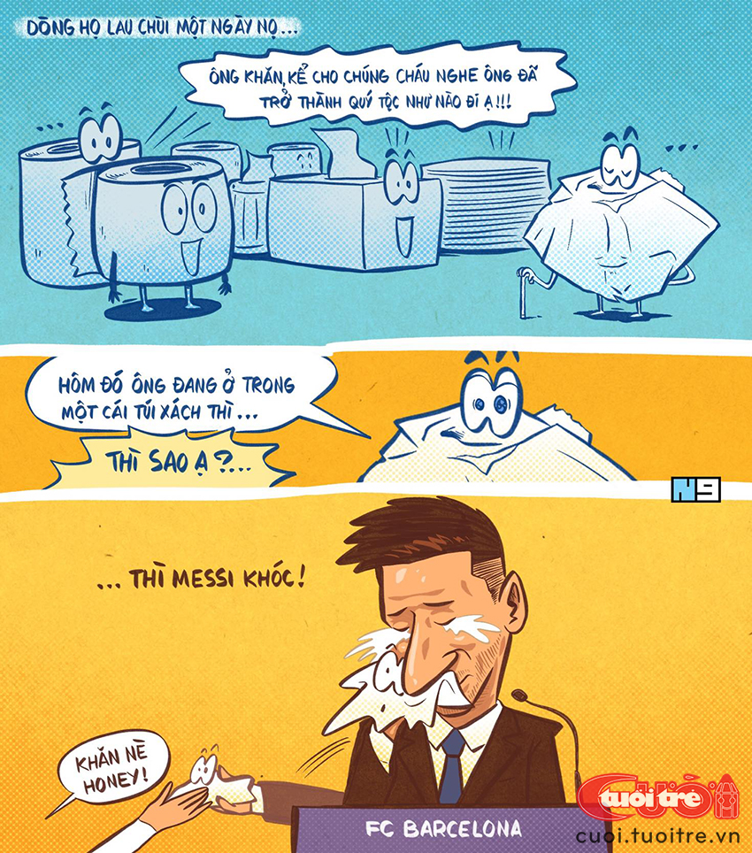 Người đang sở hữu chiếc khăn "đẫm nước mắt" này là được cho một nhân viên phục vụ trong buổi họp báo Messi rời Barcelona. Nhân viên này đã nhanh tay nhặt chiếc khăn lau nước mặt của siêu sao, trước khi nó được dọn dẹp.