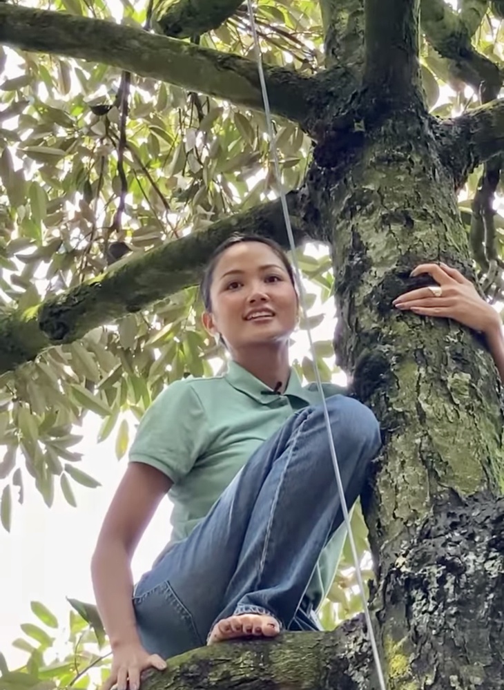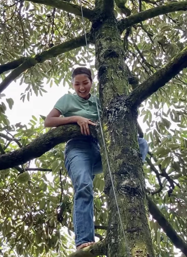 Mới đây, hoa hậu H'Hen Niê đăng tải một đoạn clip leo cây sầu riêng gây chú ý. Nàng hậu leo thoăn thoắt như một chú sóc. Thoắt một cái, cô đã lên tận ngọn sầu riêng.