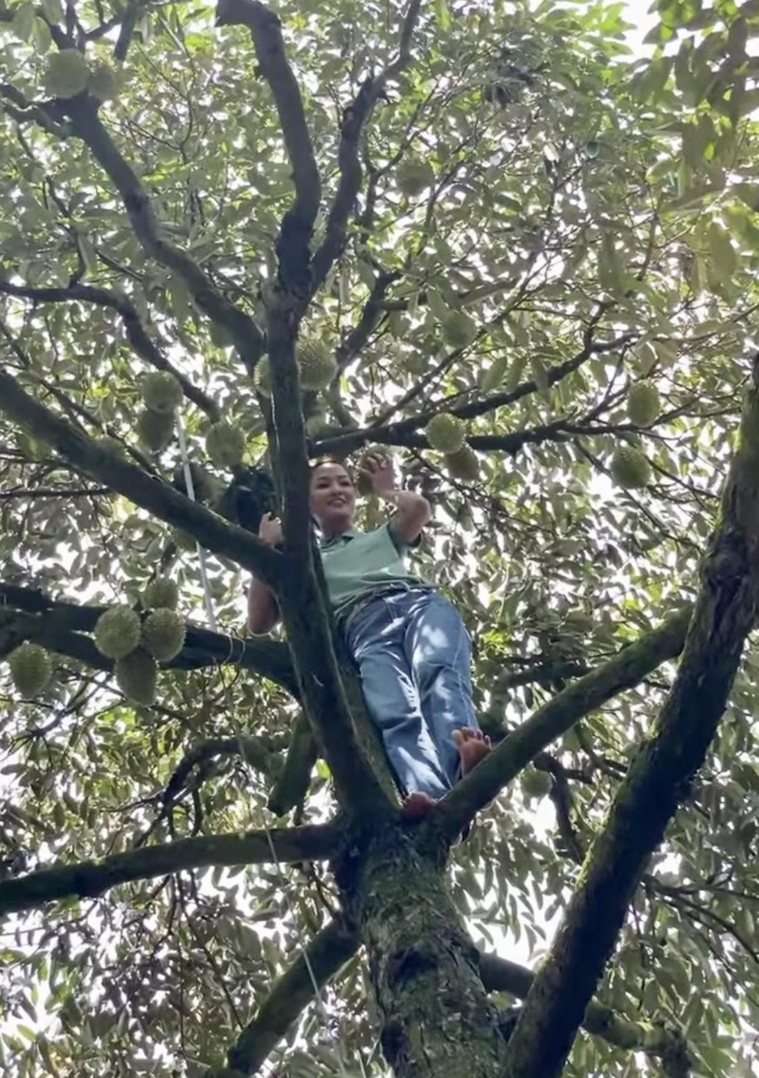 Hen leo lên ngọn sầu riêng cao chót vót. (Ảnh chụp màn hình)Lên đến ngọn, cô vui vẻ vẫy tay chào mọi người. Cô nói đùa "Bây giờ là nhảy xuống phải không, chứ bây giờ xuống làm sao?".