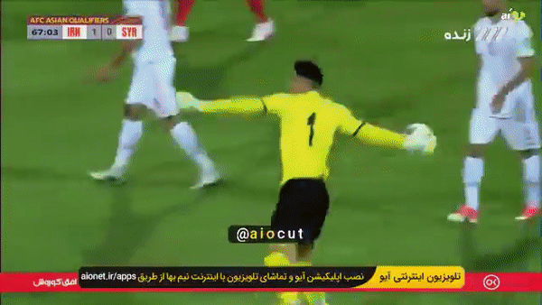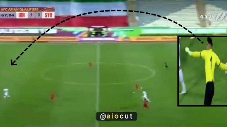 Phút 68 của trận đấu giữa Iran và Syria ở vòng loại thứ ba World Cup 2022 khu vực châu Á, thủ môn Alireza Beiranvand cầm bóng chạy ra ngoài vòng cấm và ném lên trên cho các đồng đội.