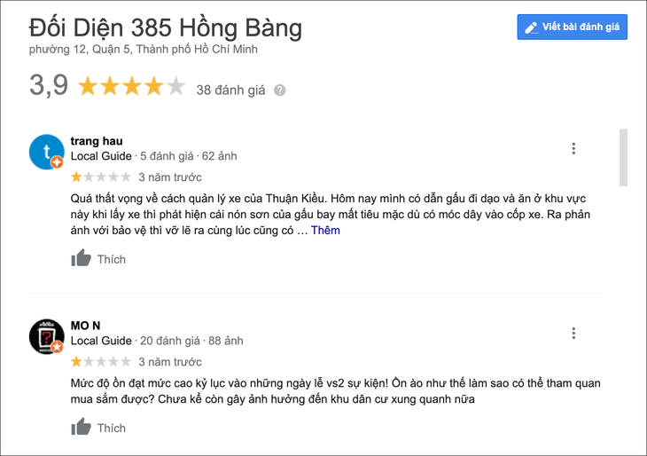 Theo đánh giá thu thập từ Google, Thuận Kiều Plaza đạt 3,9 điểm với 38 đánh giá. Với 3 đánh giá 1 sao, các tài khoản này nhận xét nơi này quá ồn, có chất lượng dịch vụ kém, đặc biệt là bảo vệ, trông giữ xe và kiến trúc phong thủy tệ. Hiện tại, từ khóa "Thuận Kiều Plaza" cũng đang nằm trong top tìm kiếm trong suốt 24h qua.