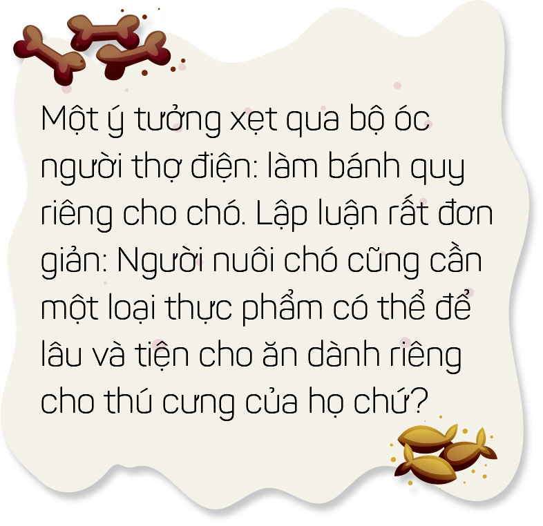 "Thẩm định viên" chất lượng không ai khác là con chó của ông. Ban đầu chú ta chê, nhưng nhanh chóng đổi thái độ khi ông chủ nặn bánh quy thành hình cục xương.