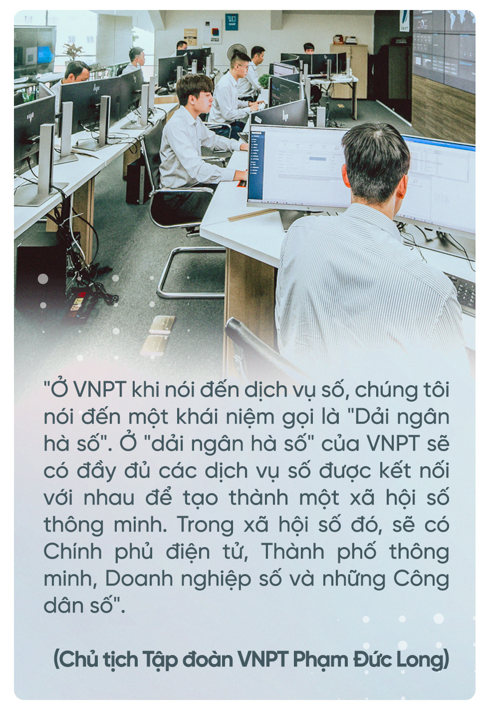 "Với VNPT những năm tới chuyển đổi số không chỉ là mệnh lệnh, sứ mệnh mà còn quyết định số mệnh của VNPT. Bởi, trong bối cảnh mảng viễn thông ngày càng suy thoái, cạnh tranh ngày càng khốc liệt thì chuyển đổi số sẽ mở ra cơ hội sinh tồn và phát triển bằng việc cung cấp các dịch vụ số, công nghệ số mới cho các doanh nghiệp, tổ chức trong một nền kinh tế số đang ngày càng rộng mở" – Người "Thuyền trưởng" của VNPT, ông Phạm Đức Long chia sẻ.