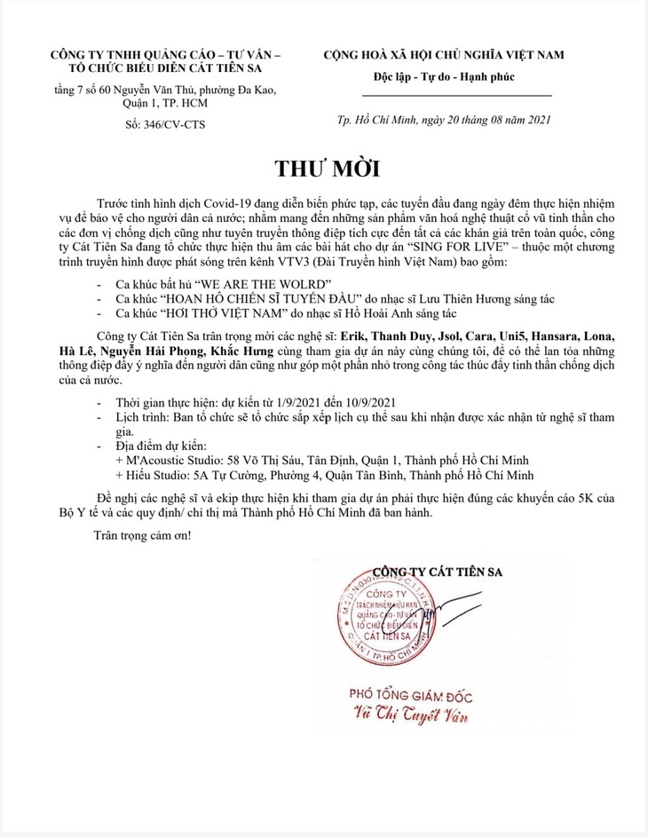 Erik cho biết, anh là ca sĩ đầu tiên có lịch thu, quay cho dự án bên cạnh nhiều tên tuổi khác. Buổi thu âm được tổ chức bởi công ty truyền thông Cát Tiên Sa và thực hiện đủ và đúng các quy tắc phòng chống dịch từ trước đó. Tuy nhiên, nam ca sĩ cũng khẳng định có nhiều thông tin không đúng trong bài đăng tố mình và ekip khiến anh phải đính chính.