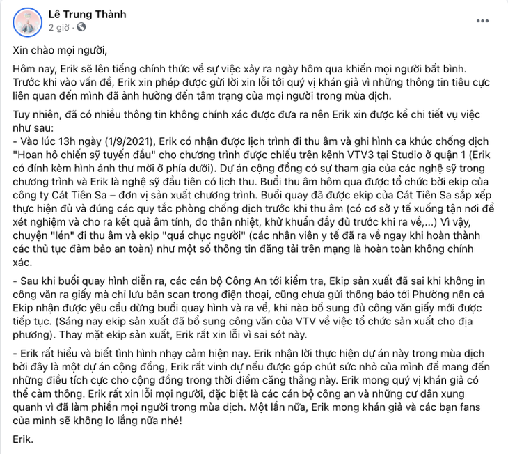 Theo đó, tới chiều ngày 2-9, phía nam ca sĩ đã chính thức lên tiếng để giải trình sự việc với người hâm mộ. Không chỉ Erik mà phía quản lý của nam ca sĩ cũng có bài đăng nêu rõ sự việc cũng như giải đáp những thắc mắc của người hâm mộ trong suốt nhiều giờ qua.