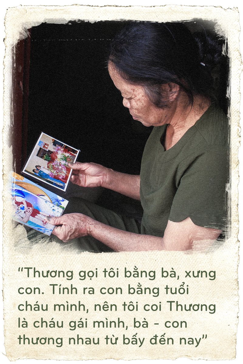 Ngồi trước sân nhà, hai mái đầu - một đã ngả sang màu bạc, một mái đầu còn xanh - lần giở lại những tấm hình chụp chung. Thương mân mê tấm hình quý giá chụp hai bà cháu lúc sinh nhật em tròn 1 tuổi.