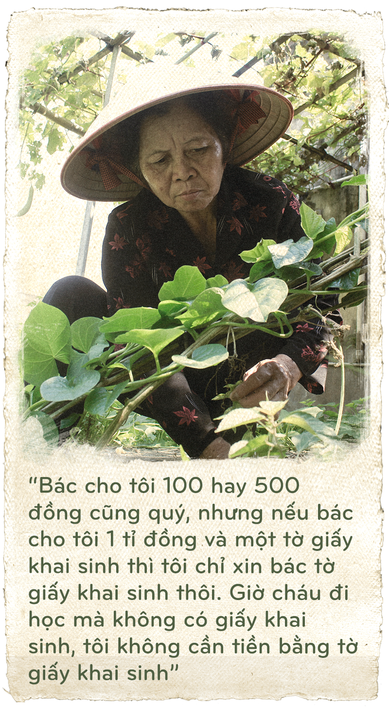 Bà khóc: "Bác cho tôi 100 hay 500 đồng cũng quý, nhưng nếu bác cho tôi 1 tỉ đồng và một tờ giấy khai sinh thì tôi chỉ xin bác tờ giấy khai sinh thôi. Mẹ nó bỏ nó từ 17 tháng tuổi, ngày mẹ nó gửi có ai hỏi giấy khai sinh đâu. Giờ cháu đi học mà không có giấy khai sinh, tôi thương cháu lắm, tôi không cần tiền bằng tờ giấy khai sinh".