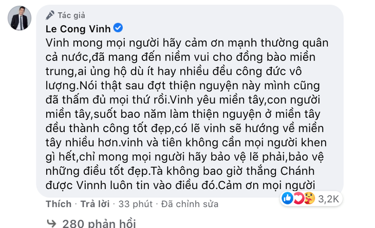 “Vinh mong mọi người hãy cảm ơn mạnh thường quân cả nước, đã mang đến niềm vui cho đồng bào miền Trung, ai ủng hộ dù ít hay nhiều đều công đức vô lượng. Nói thật sau đợt thiện nguyện này mình cũng đã thấm đủ mọi thứ rồi.
