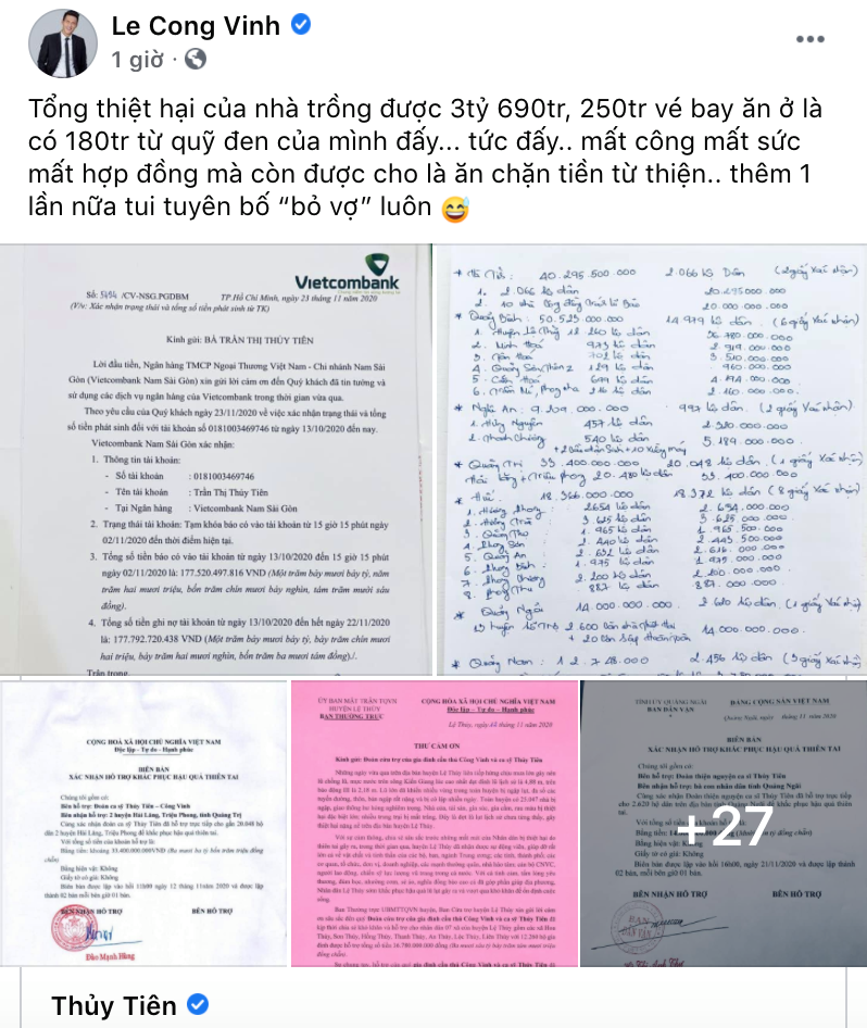 Công Vinh chia sẻ bài viết sao kê minh bạch toàn bộ tiền cứu trợ của bà xã. Anh tiết lộ phải bỏ tiền quỹ đen cứu trợ vẫn bị nói ăn chặn.Công Vinh bức xúc cho biết, không chỉ bỏ tiền túi để thêm vào các chuyến từ thiện, vợ chồng anh còn mất công sức và cả hợp đồng, nhưng vẫn bị nói ăn chặn.