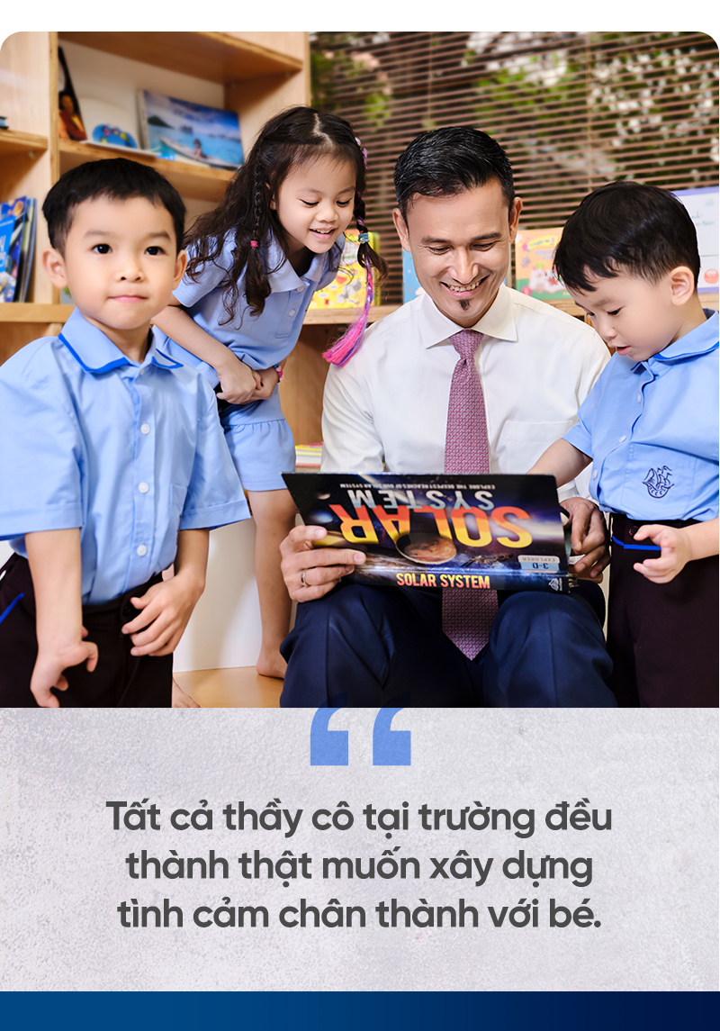 Chúng tôi tập trung vào sứ mệnh chăm sóc học trò tận tâm. Thầy cô gặp các con mỗi buổi sáng khoảng 35 phút, trò chuyện với trẻ về bản sắc của trẻ, quan hệ với mọi người xung quanh, những điều xảy ra ở nhà… để chúng tôi hiểu có thể chăm sóc con ra sao.