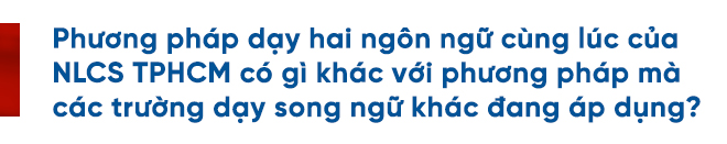 Ở NLCS TPHCM, chúng tôi áp dụng phương pháp Ngâm ngôn ngữ [Dual language immersion] tức là dạy cả hai ngôn ngữ cho trẻ trong cùng một lớp học. Ví dụ, khi bé học môn địa lý, thầy giáo nước ngoài sẽ nói "So in HCMC we have districts. How many districts are there in the city?", rồi ngay lúc đó, cô giáo nói tiếng Việt có thể hỏi bé luôn: "Các con có biết vì sao thành phố mình lại chia thành nhiều quận không? Có thành phố nào giống như vậy không?"