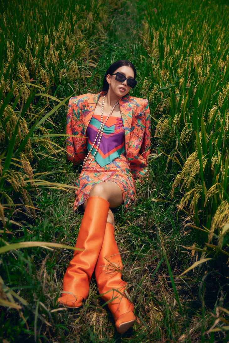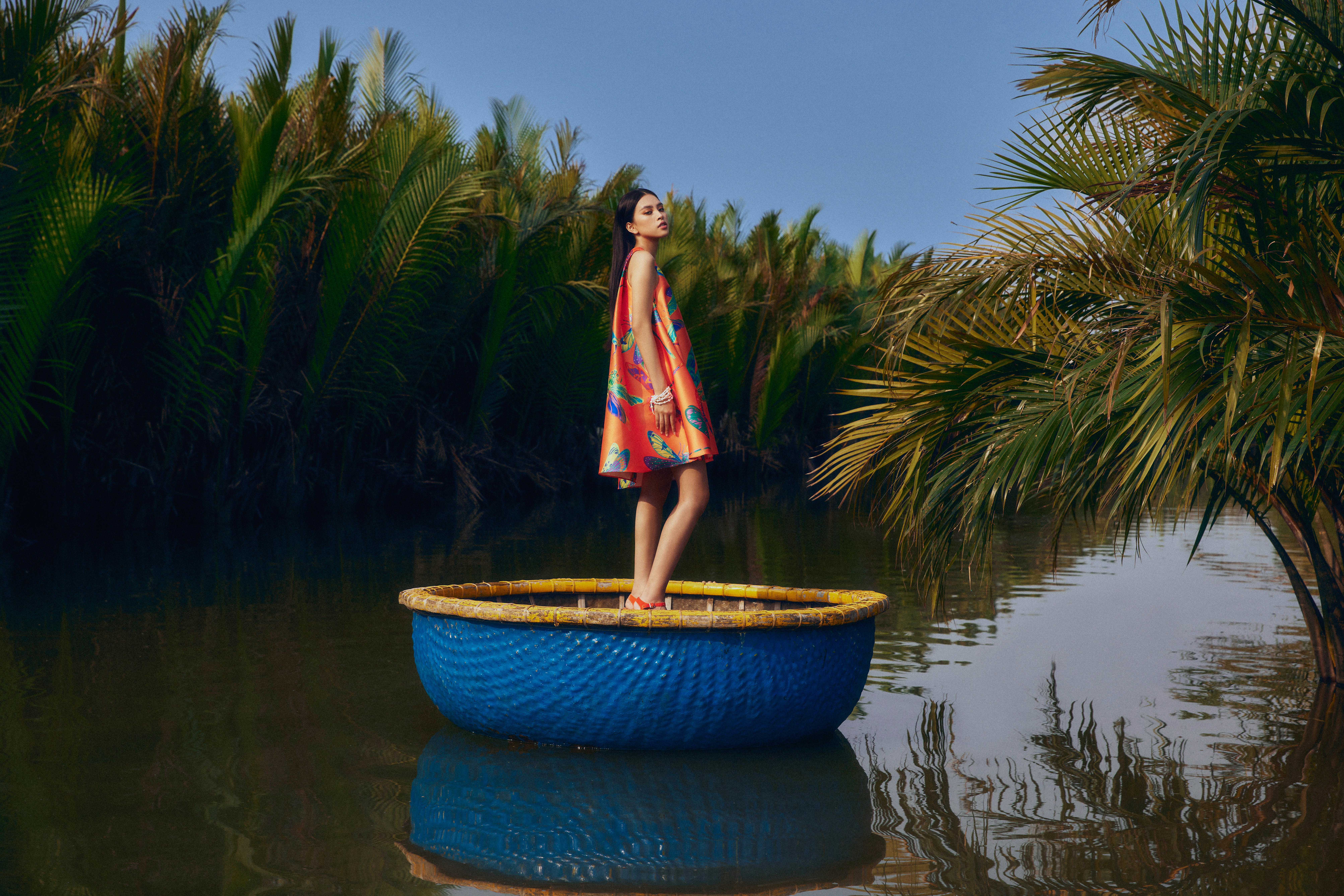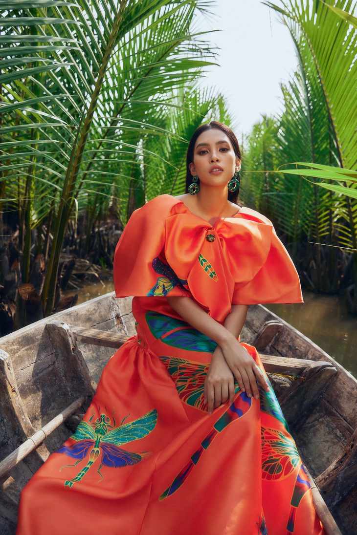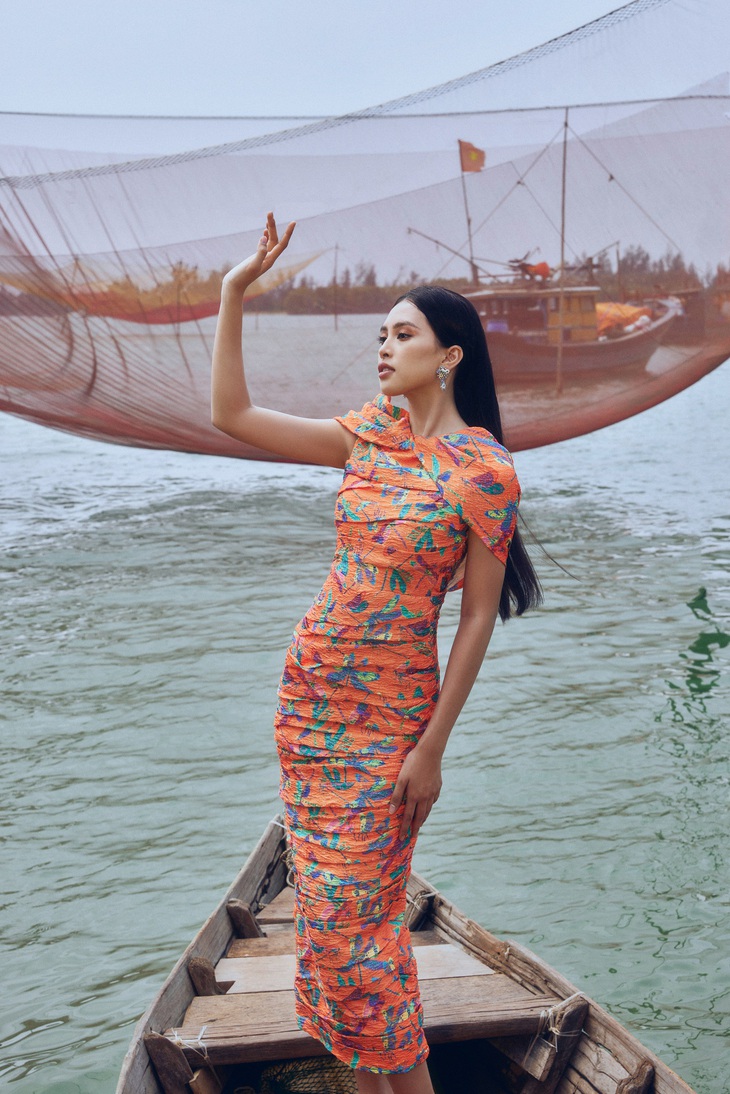 Tiểu Vy tạo dáng trên thuyền thúng - Ảnh: NTK cung cấpNhà thiết kế Đinh Trường Tùng chia sẻ: “Lần này chúng tôi muốn mang đến một sắc màu thú vị giữa thiên nhiên và đất trời Hội An thông qua họa tiết chuồn chuồn sắc màu trên các thiết kế thuộc bộ sưu tập resort 2022”.