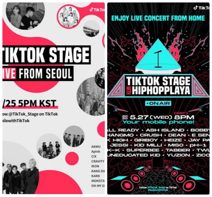 Các buổi hoà nhạc chính thức được phát sóng tại tài khoản TikTok_stage (Sân khấu TikTok) với các màn biểu diễn hoàn toàn trực tiếp và không được ghi hình trước. Những ngôi sao tham gia buổi hoà nhạc đầu tiên Sân khấu TikTok - trực tiếp từ Seoul ngày 25-5 là 9 nhóm nhạc và nghệ sĩ K-POP hàng đầu như: Monsta X, iKon, Kang Daniel, AKMU, Apink…