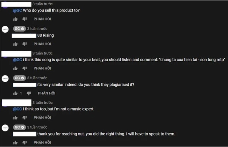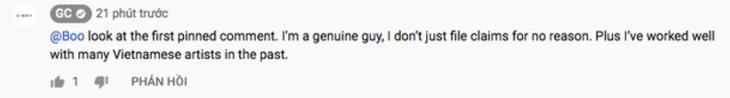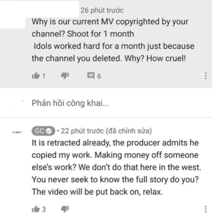Ngay sau khi sự việc xảy ra, tài khoản YouTube GC đưa ra bình luận như sau: "Clip đã được rút về rồi. Nhà sản xuất thừa nhận anh ấy đã sao chép tác phẩm của tôi. Kiếm tiền từ công việc của người khác. Chúng tôi không làm điều đó ở phương Tây. Bạn không bao giờ tìm cách biết câu chuyện phải không. Video đó sẽ sớm trở lại thôi, thư giãn đi". Thế nhưng, bình luận này đã sớm bị xòa trên kênh YouTube.