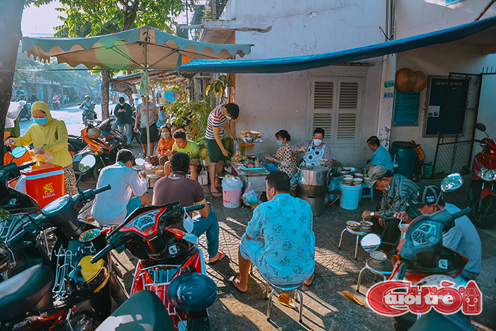 Khung cảnh quen thuộc ở tiệm cháo không tên toạ lạc tại số T6 đường Nguyễn Hữu Hào (Phường 8, Quận 4, TP.HCM). Thông thường thực khách sẽ kêu thêm 1, 2 tô nữa để ăn cho thoả thích. (Ảnh: NGỌC PHƯỢNG)Khách đến tiệm cháo không tên này vốn thường là khách quen, cứ gọi số lượng tô rồi ngay tức thì sẽ được phục vụ, kèm một phần giò chéo quẩy và lát chanh. Ai cũng như ai đều ngồi ăn trên chiếc ghế nhỏ. Còn bàn? Chỉ đơn giản là một chiếc ghế cùng loại, được đặt đối diện trước mặt. Thoạt nhìn cứ như khung cảnh của một vùng quê nào đó, chứ không ai nghĩ đang ở Sài Gòn.