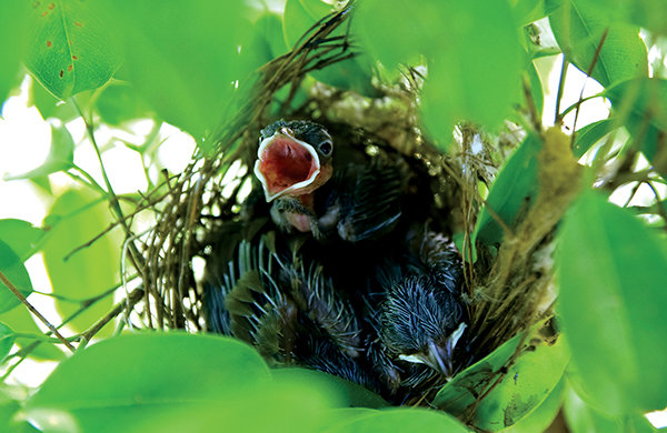 Ba con chim non mới nhú lông tơ nằm im trong tổ khi một trong hai con chim bố mẹ thét lên liên hồi bởi chim kia đã đậu vào cành cây đầy keo dính của người bẫy chim. Chỉ cần động nhẹ là con chim non còn đói lập tức há mồm. Ảnh : Văn Ánh Cành cây ấy được cài vào trụ điện cách tổ chim chừng 30m. (Không rành về chim nên anh không rõ con còn lại là chim bố hay chim mẹ). Thương lũ chim non, anh ra khuyên người bẫy chim hãy thả con chim vừa bẫy đang nhốt trong lồng kia ra để nó cùng kiếm mồi nuôi con, nhưng lời đề nghị người đàn ông lớn tuổi hơn mình nhiều đã bất thành. Những ngày trước đó anh thấy từ sáng đến chập tối, chim bố mẹ thường xuyên bay đi bay về tổ mớm mồi cho con. Nhưng hôm nay chỉ còn một con, anh nghĩ chắc lũ chim non sẽ không no. Thế là mỗi ngày anh dành chút ít thời gian cho mấy chú chim hoành hoạch làm tổ trong cây xanh kiểng sau hè nhà mình. Từ ngày một trong hai chim bố (mẹ) bị bẫy, chim còn lại không những vất vả hơn để kiếm mồi mà như “gan” hơn khi thấy người đứng gần tổ. Hôm nào nhà có nấu món thịt, anh để ý khi thấy chim bố (mẹ) bay đi xa là xé thịt nạc chín mớm cho mấy chú chim non. Chúng há mồm rõ to khi có tiếng sột soạt gần tổ. Tổ chim chỉ cao ngang tầm mắt nên anh cũng dễ dàng mớm mồi. Thêm vài lần anh đi bắt cào cào, châu chấu về cho chim non ăn thêm, mong chúng chóng đủ lông đủ cánh... Một tuần trôi qua, hai trong ba chim non đã sải cánh rời tổ. Còn một con yếu hơn phải chờ đến hai ngày sau mới đủ sức bay vào khoảng trời của chúng. Tags: Tổ chimHoành hoạch