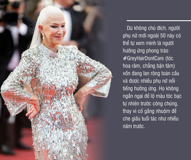 Tại Liên hoan phim Cannes hồi tháng 7-2021, các diễn viên Andie MacDowell, Helen Mirren và Jodie Foster - lúc đó lần lượt 63, 75 và 58 tuổi - đều tự tin khoe mái tóc hoa râm trên thảm đỏ.