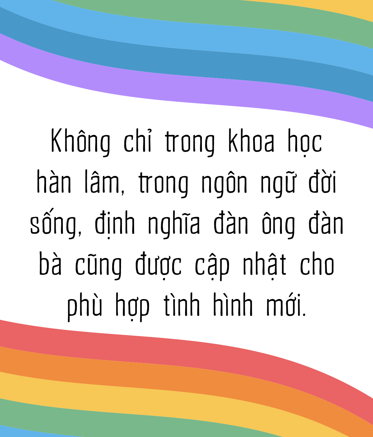 Một người có thể tự nhận mình là nam, nữ, không ai, cả hai hoặc một số loại khác độc lập với bộ phận sinh dục của họ".