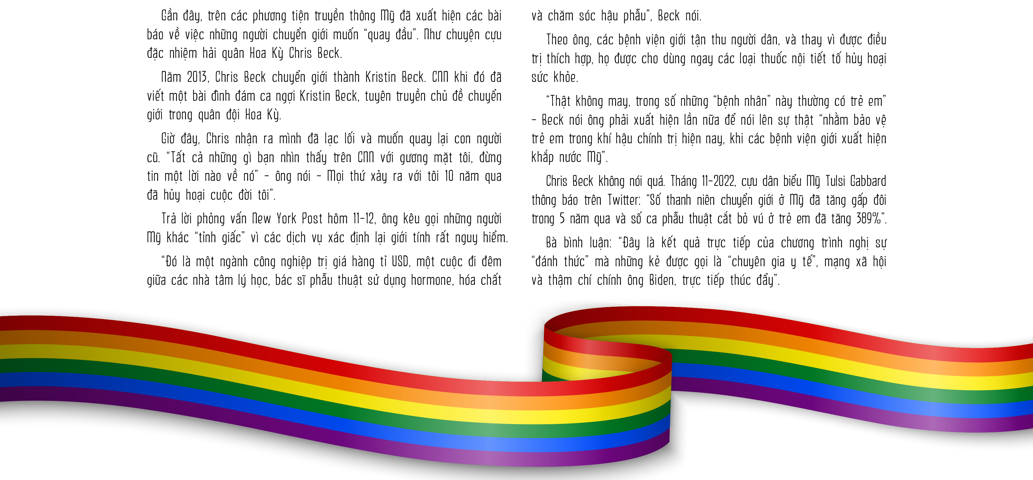 Nhưng những câu chuyện thức tỉnh như của Chris Beck có vẻ chìm khuất trong làn sóng phổ cập sự đa dạng giới cũng như việc tuyên truyền chuyển giới. Năm 2022, không ít nước trên thế giới đã có những hiệu chỉnh luật cho phù hợp tình hình mới.