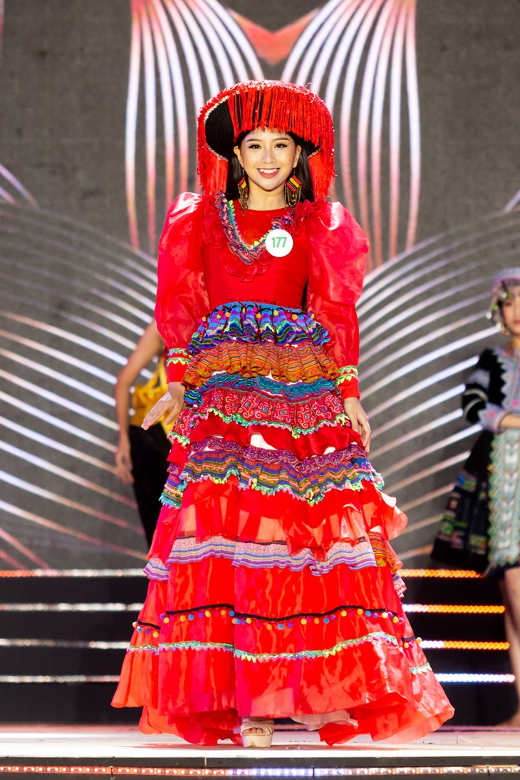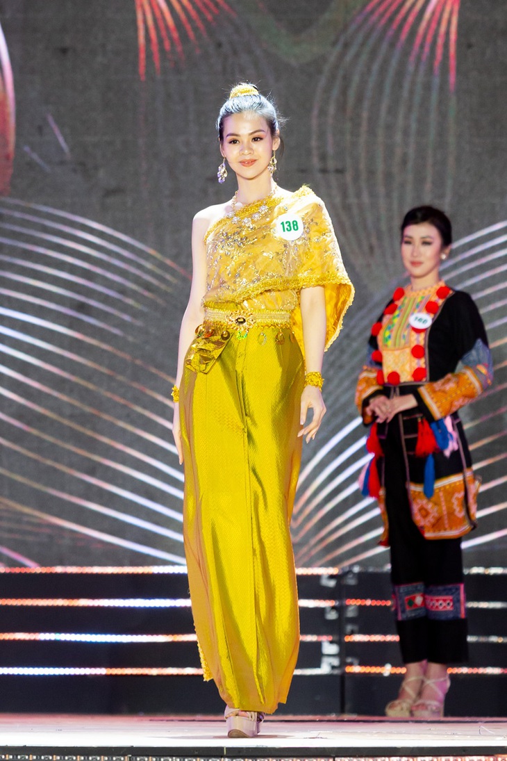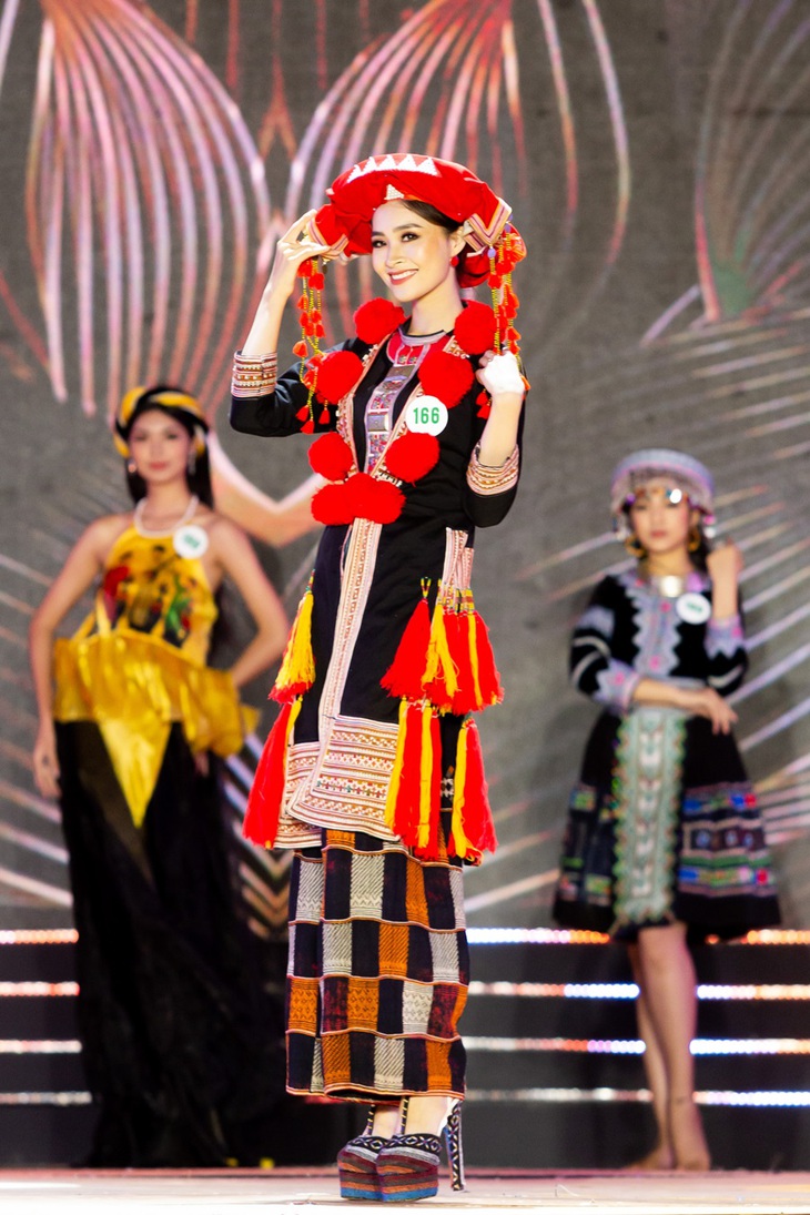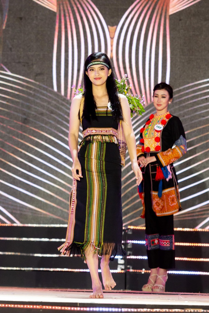 Theo chia sẻ từ ban tổ chức, bộ sưu tập trang phục dân tộc làm từ chất liệu thổ cẩm được sáng tạo dựa trên những trang phục truyền thống của các dân tộc. Thế nhưng, cảm xúc của khán giả chưa được trọn vẹn khi các bộ trang phục đặc trưng, có tính lịch sử của dân tộc khá mất cân đối khi 'lênh khênh' trên giày cao gót hiện đại.