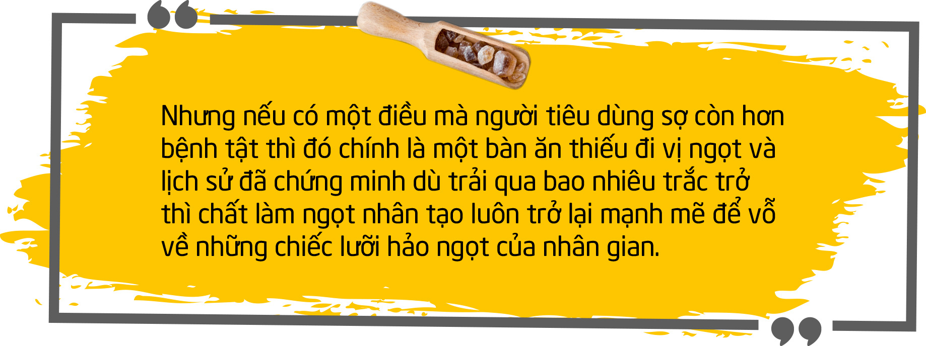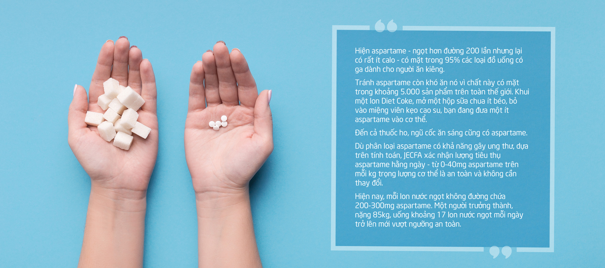 Trong chiều dài lịch sử gây tranh cãi của chất làm ngọt nhân tạo, aspartame là ví dụ điển hình cho những "cuộc chiến" có liên quan: giữa khoa học và ngành thực phẩm, giữa chính quyền và nhà sản xuất, và giữa người tiêu dùng với túi tiền và sức khỏe của mình.