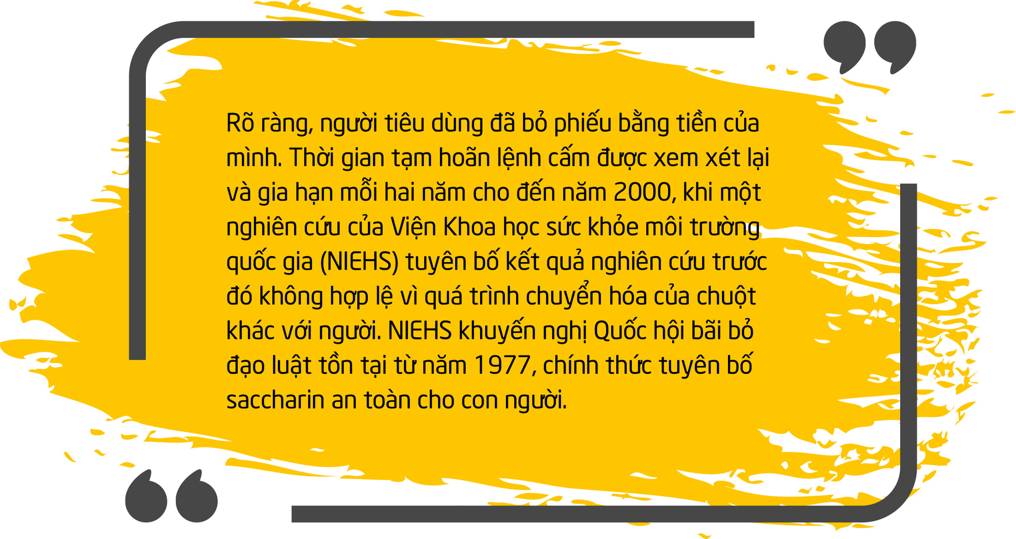 Năm 1977, một lệnh cấm saccharin chính thức có hiệu lực và chỉ trong vòng một tuần sau đó, Quốc hội Mỹ nhận được hơn 1 triệu lá thư phản đối. Sự phản ứng dữ dội của công chúng đối với một quy định mà nhiều người xem là sự can thiệp quá mức của chính phủ vào đời sống cá nhân khiến Quốc hội phải chặn lệnh cấm của FDA và ban hành đạo luật thay thế trong cùng năm.