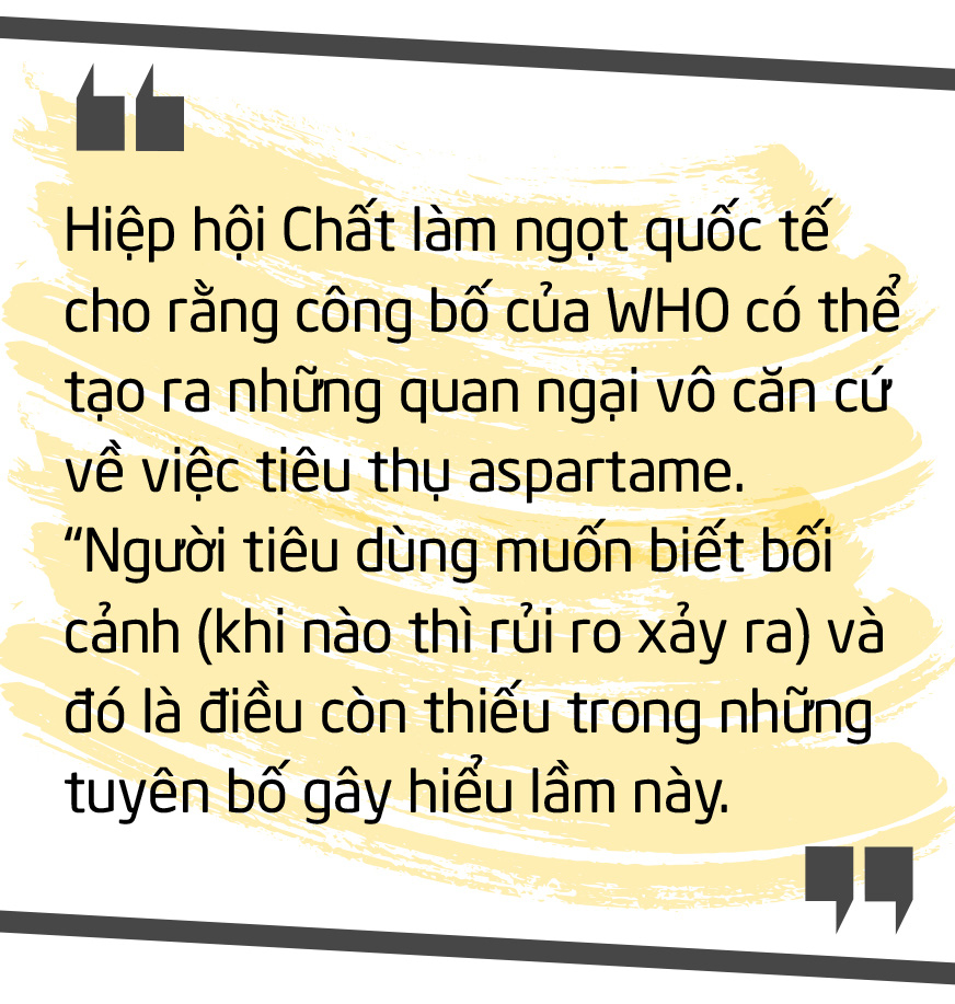 Không có dấu hiệu nào cho thấy tuyên bố của WHO khiến cuộc tranh luận về tính aspartame ngã ngũ. Về phía các doanh nghiệp sản xuất nước ngọt, dĩ nhiên, đây sẽ là cuộc chiến để bảo vệ ngành hàng trị giá 428 tỉ USD mà họ không muốn thua.