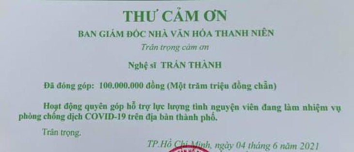 Phía Trấn Thành đã công khai toàn bộ giấy tờ chứng minh việc đóng góp này thông qua trang cá nhân của quản lý của anh vào sáng 7-6.