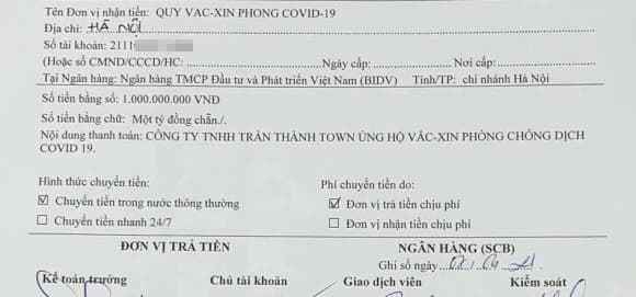 Rốt cuộc cũng xong. 100 triệu cho quỹ ủng hộ tình nguyện viên phòng chống Covid của Nhà Văn Hoá Thanh Niên và 1 tỉ cho Quỹ mua vaccine”.