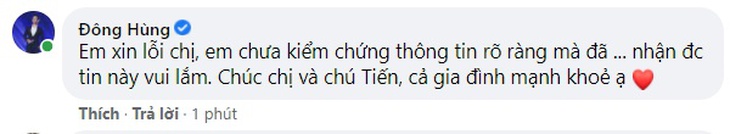Dưới bài đăng của Hà Trần, ca sĩ Đông Hùng đã nhanh chóng để lại lời xin lỗi gửi tới gia đình đàn chị. Nam ca sĩ cho biết, trước đó khi nghe hung tin về nhạc sĩ Trần Tiến, anh đã có hành động vội vàng chia sẻ thông tin này mà không kiểm chứng nguồn tin. Anh bày tỏ khi nhận được thông tin chính thức về tình hình sức khỏe của nhạc sĩ gạo cội: "Chúc chị và chú Tiến, cả gia đình mạnh khỏe".