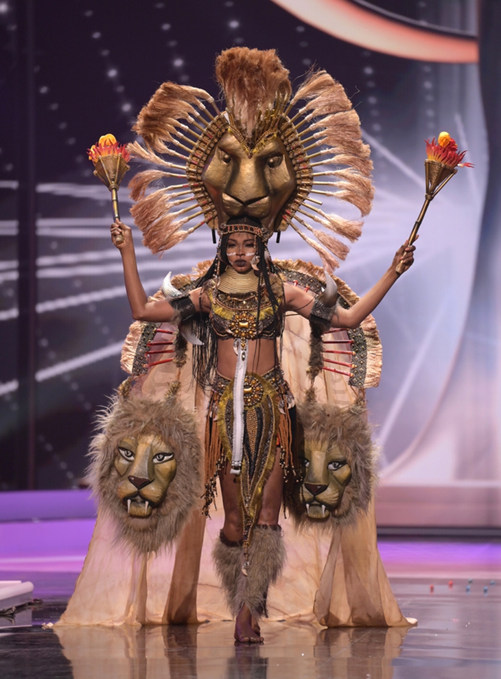 Trang phục dân tộc của hoa hậu Camaron hoang dã với mặt nạ ba chú sư tử