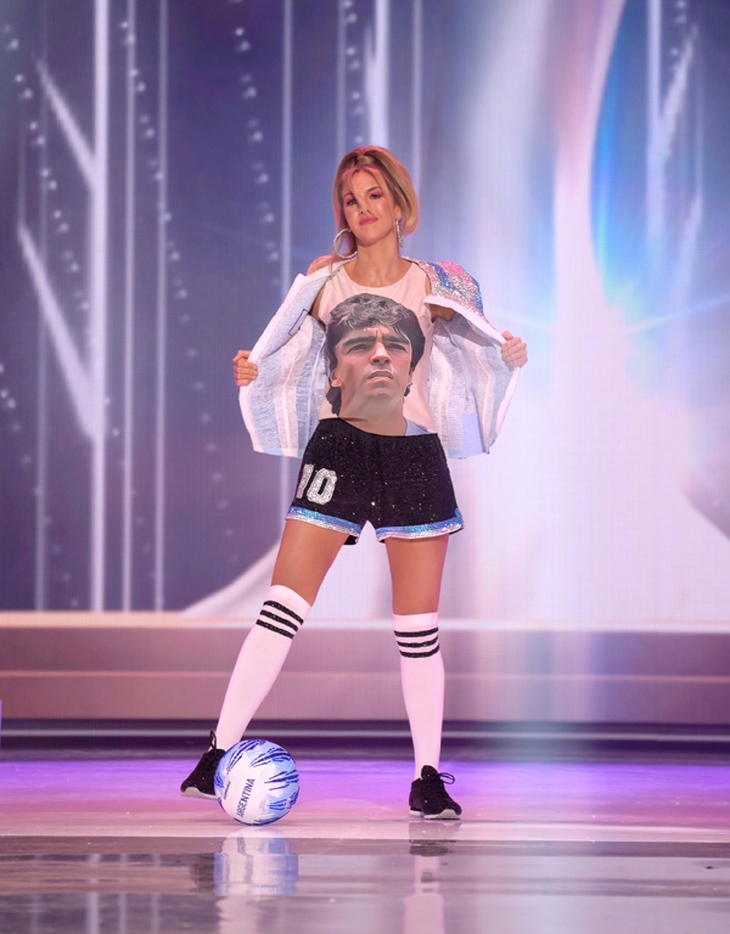 Hoa hậu Argentina mặc trang phục thể thao có hình cố danh thủ Maradona và số 10 huyền thoại của anh.