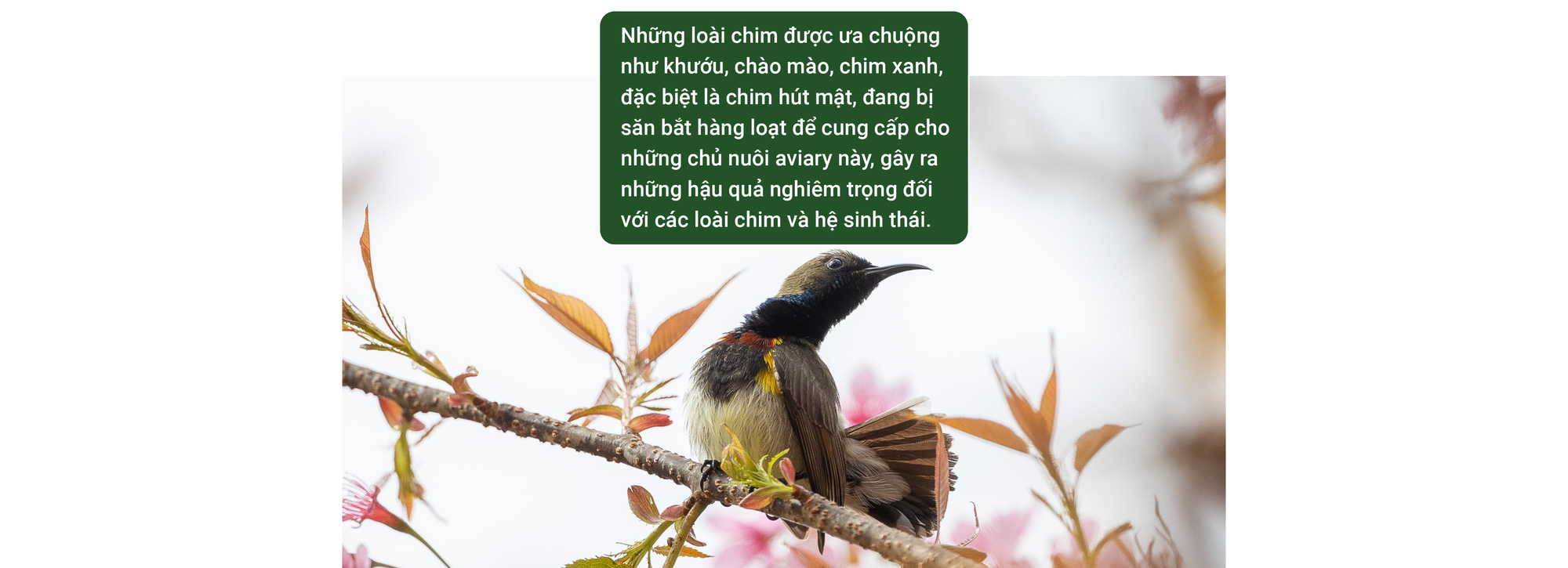 Đặc biệt, chim hút mật - loài đóng vai trò quan trọng trong việc thụ phấn - đang bị bắt về làm cảnh, khiến hệ sinh thái bị ảnh hưởng nghiêm trọng. Không còn những con chim hút mật bay lượn, nhiều loại cây cần thụ phấn tự nhiên đã và sẽ còn bị suy giảm về số lượng, dẫn đến mất cân bằng hệ sinh thái.