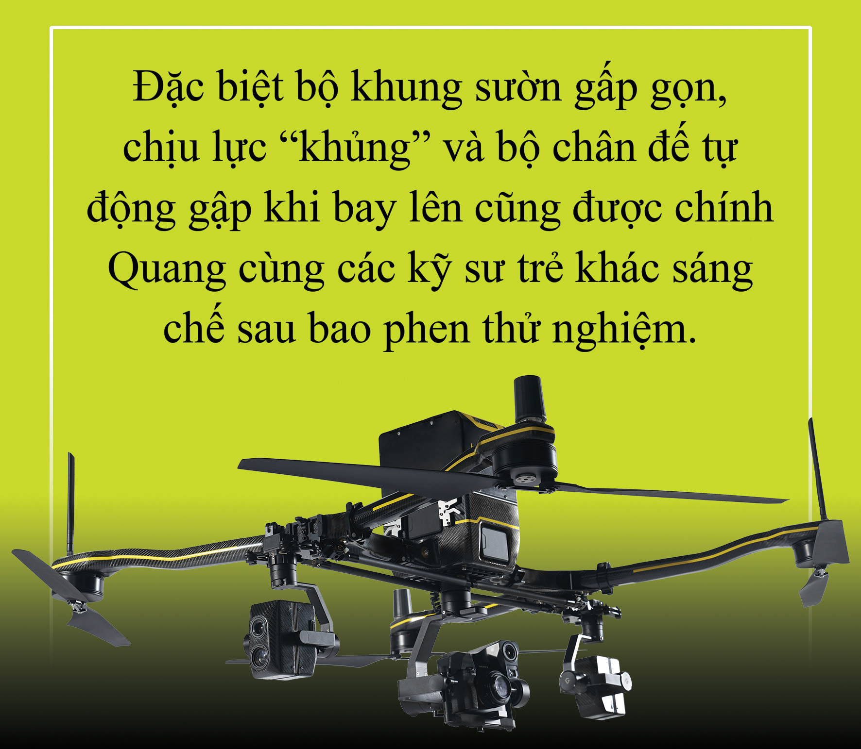 Đứng bên cạnh chiếc Hera, ông Quốc giới thiệu những ưu điểm vượt trội khi đây là thiết bị bay không người lái nhỏ gọn song có thể nâng tải nặng, lại bay được gần một giờ.