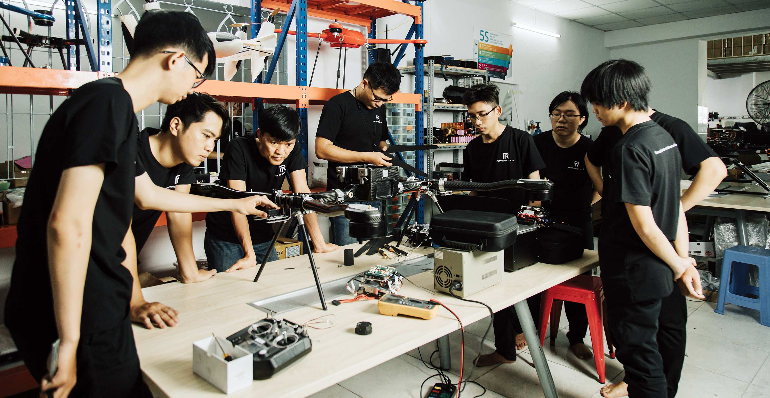 Một căn nhà kế bên Khu công nghệ cao TP.HCM được Công ty RtR đặt làm "đại bản doanh" với mỗi tầng là một bộ phận gồm cả nghiên cứu và phát triển (R&D), sáng chế, cơ khí, AI (trí tuệ nhân tạo)… với gần 60 kỹ sư, nhân viên. Ngay tầng trệt, các sản phẩm, máy móc chật kín từ sân vào nhà, chẳng khác một xưởng cơ khí.