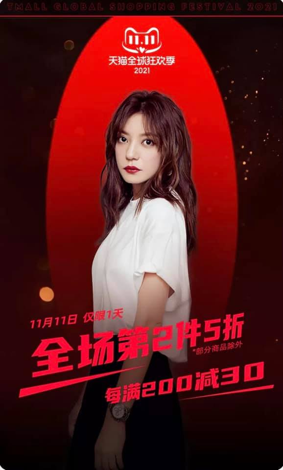 Hình ảnh Triệu Vy xuất hiện trên poster Ngày hội mua sắm toàn cầu Tmall.Trước những tò mò và câu hỏi không ai trả lời của cư dân mạng, vào khuya ngày 9-11, một số hình ảnh của Triệu Vy bất ngờ xuất hiện trên poster quảng cáo của Ngày hội mua sắm toàn cầu Tmall (11-11-2021).