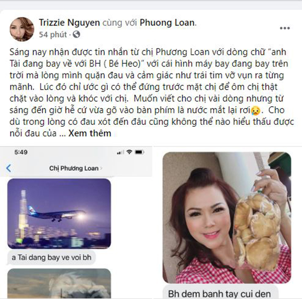 Trizzie Phương Trinh chia sẻ: "Sáng nay nhận được tin nhắn từ chị Phương Loan với dòng chữ 'anh Tài đang bay về với Bé Heo', kèm với tấm hình máy bay đang bay trên trời mà lòng mình quặn đau, cảm giác như trái tim vỡ vụn ra từng mảnh. Lúc đó chỉ ước gì có thể đứng trước mặt chị để ôm chị thật chặt vào lòng và khóc với chị. Muốn viết cho chị vài dòng nhưng từ sáng đến giờ hễ cứ vừa gõ vào bàn phím là nước mắt lại rơi".