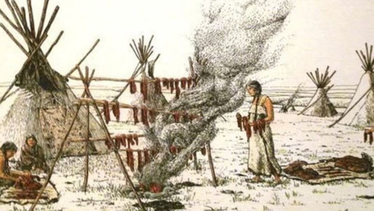 Hình vẽ tái hiện cảnh hun khói thịt để làm pemmican