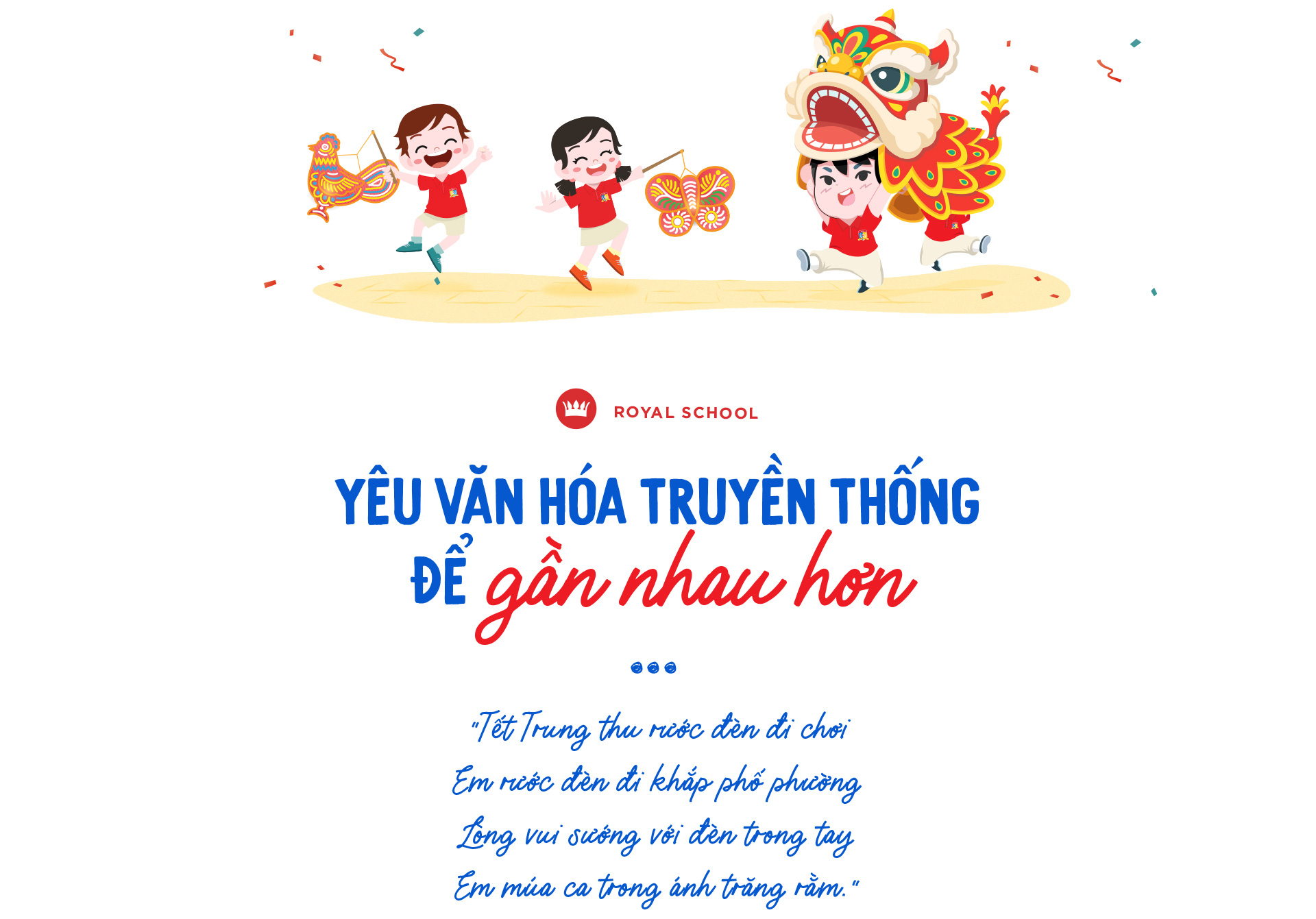 Khi những khúc ca quen thuộc mùa trăng tròn này vang lên, trong tâm trí trẻ thơ háo hức biết rằng trung thu đã đến. Và đặc biệt hơn nữa khi tại Royal School, những màn đồng ca của thầy cô giáo nước ngoài cùng hòa thanh tạo nên không gian mới mẻ, đầy cảm hứng.
