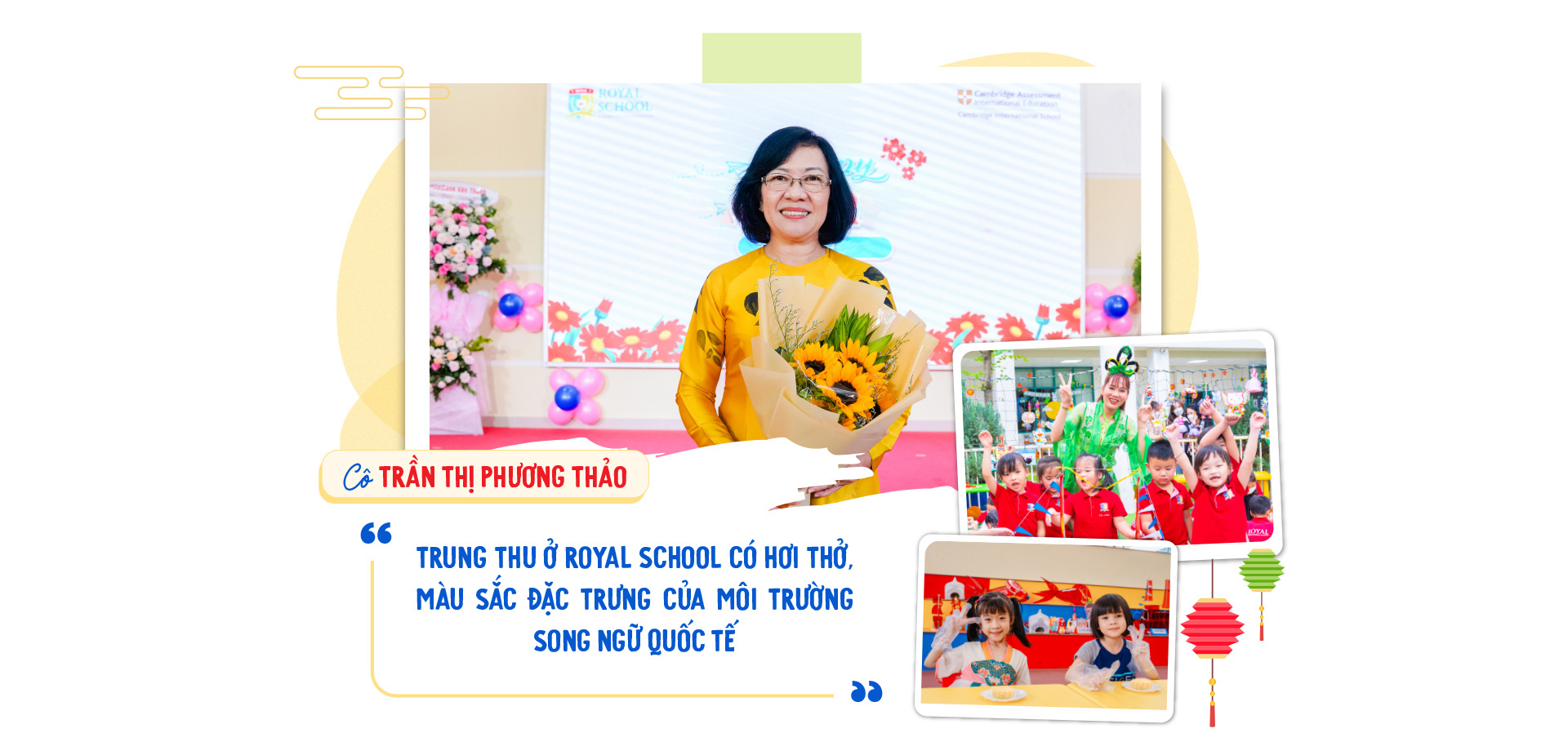 "Trung thu ở Royal School có hơi thở, màu sắc đặc trưng của môi trường quốc tế song ngữ. Mỗi chương trình, hoạt động các thầy cô đều chăm chút để hài hòa giữa những điều tạo nên giá trị truyền thống và yếu tố hiện đại, hội nhập.