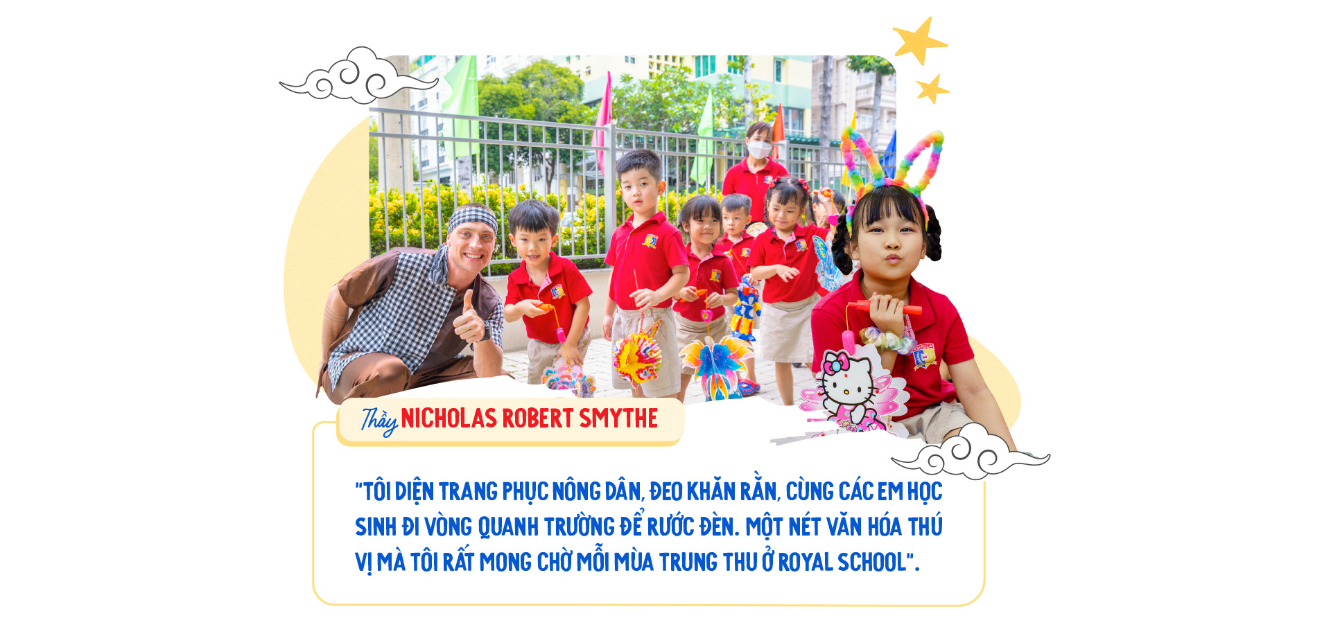 Đã hóa thân thành chú Cuội trong suốt 4 mùa trung thu liên tục, thầy Nicholas Robert Smythe (điều phối chuyên môn ở Royal School) có rất nhiều kỷ niệm khó quên khi được tham gia một hoạt động truyền thống ý nghĩa của Việt Nam.