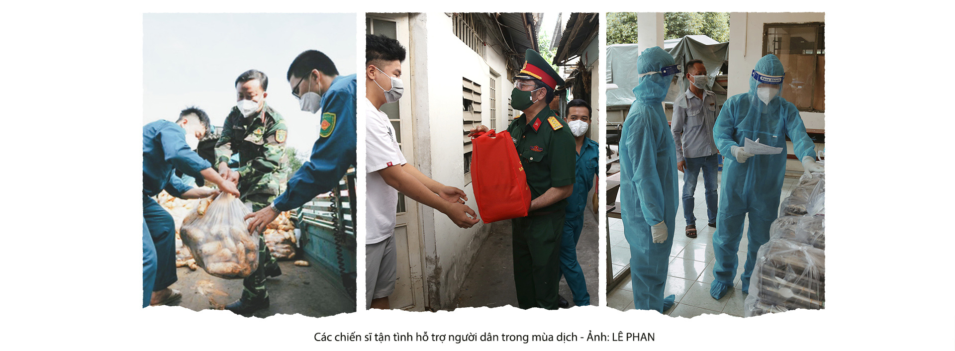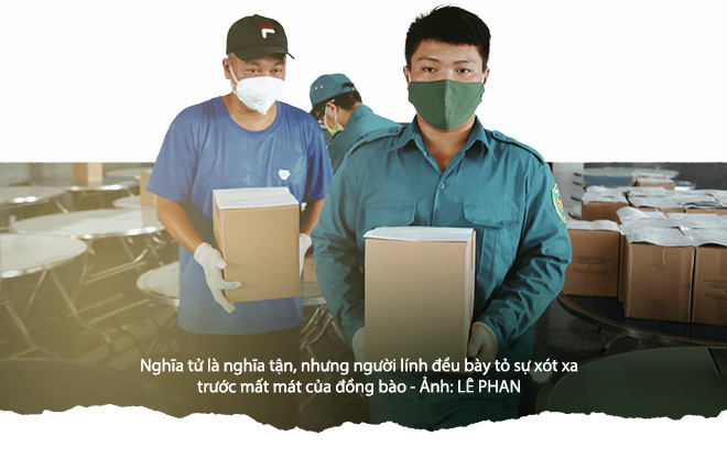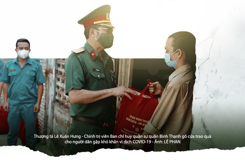 Có những người dân trụ lại thành phố sau gần 3 tháng dịch bệnh đang dần kiệt sức vì những khó khăn chồng chất, cũng là lúc bộ đội đến với người dân. Sáng 9-8, thượng tá Lê Xuân Hưng - chính trị viên Ban chỉ huy quân sự quận Bình Thạnh - cùng đồng đội ôm theo hộp quà, len lỏi vào một con hẻm sâu hút trên đường Xô Viết Nghệ Tĩnh trao tận tay người dân. Những suất quà gồm: gạo, mì gói, nước tương, nước mắm... giá trị không quá lớn nhưng trong những ngày khó khăn này đó là nghĩa tình, sẻ chia giữa quân - dân. Của cho không bằng cách cho, việc quân đội gõ cửa từng nhà để trao quà cho dân cũng phần nào xoa dịu những khó khăn.