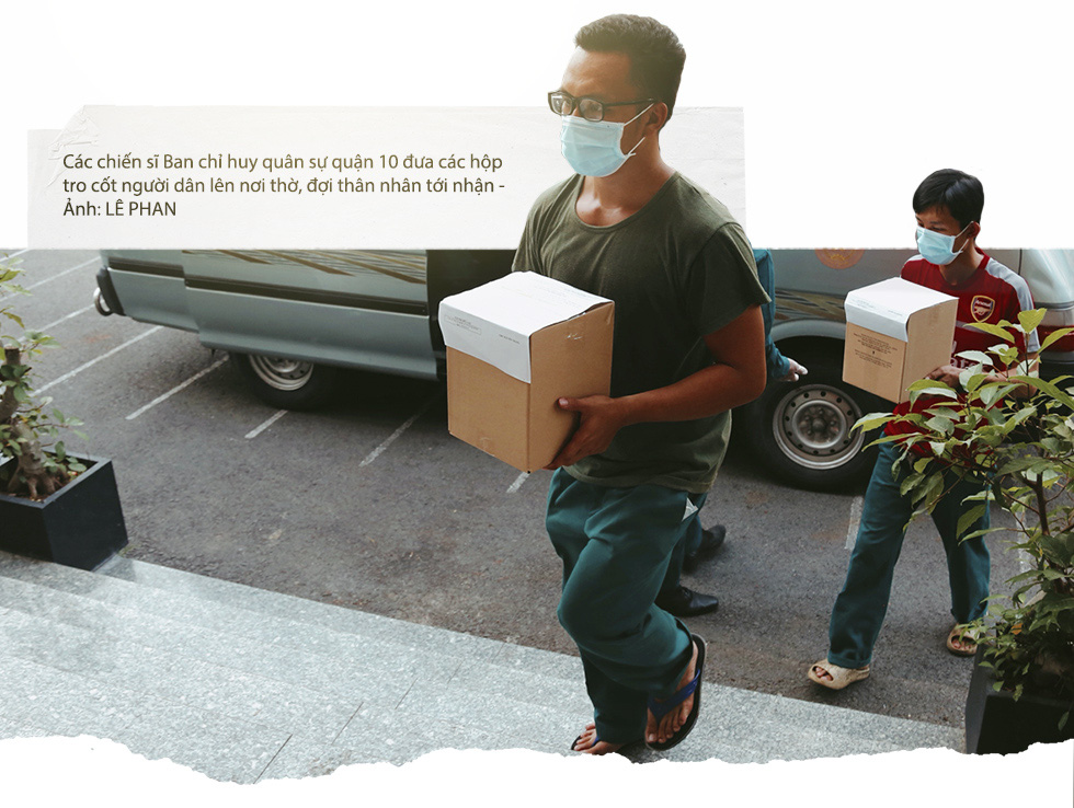Gần đây nhất, trong toàn bộ hành trình đưa tro cốt của một người dân quận Bình Thạnh về với thân nhân, tôi đã thấy thiếu tá Lê Trung Chánh - chủ nhiệm hậu cần kỹ thuật Ban chỉ huy quân sự quận Bình Thạnh - luôn dõi mắt, luôn miệng nhắc nhở mọi người cẩn trọng khi nhận tro cốt đồng bào từ nơi hỏa táng. Đến nhà tang lễ thành phố, anh lặng lẽ đốt ba nén nhang, khấn điều gì đó rồi đứng trầm ngâm một lúc bên những hộp đựng tro cốt xếp trên bàn.