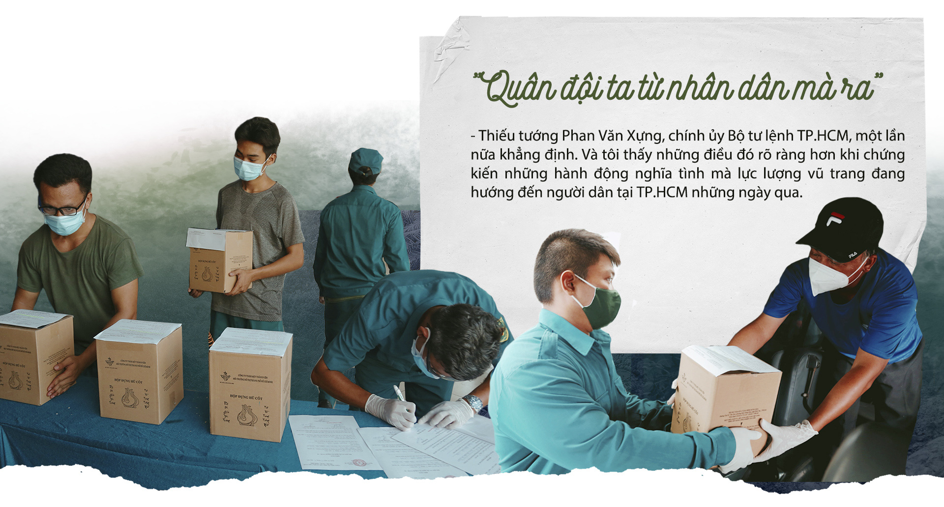 Những ngày qua, hình ảnh các cán bộ, chiến sĩ quân đội tại TP.HCM trực tiếp đưa từng hũ tro cốt người dân tử vong do COVID-19 đến giao tận nhà cho người thân, hay những gói quà được bộ đội đưa vào tận các hẻm phong tỏa khiến bức tranh chống dịch thêm phần chia sẻ, bớt phần bi thương.